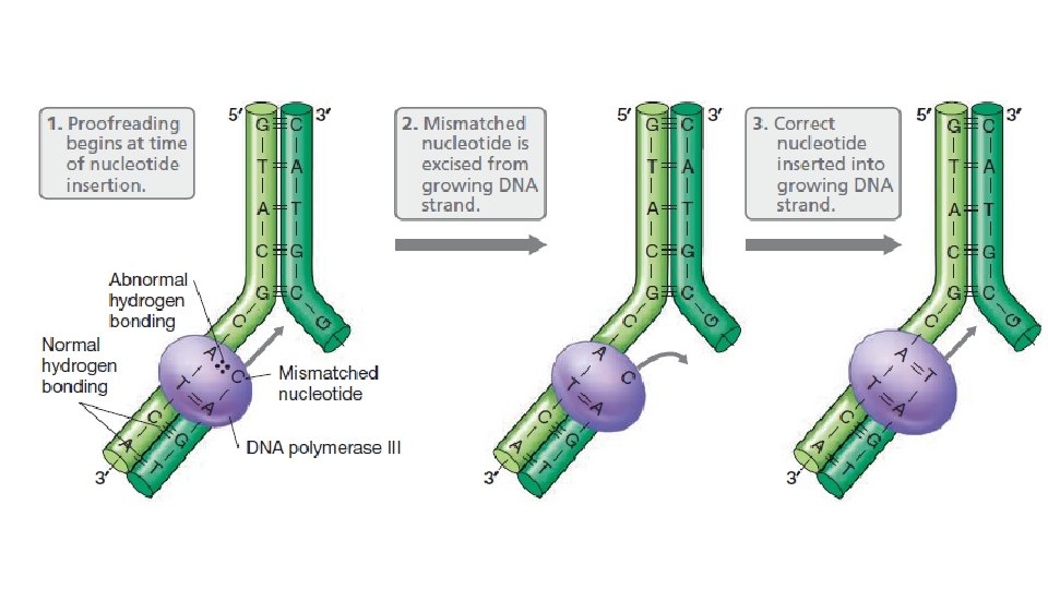 • DNA replikasyonunun uygunluğu: düzeltme • DNA replikasyonunda hata oranı önemli derecede düşüktür. Buna rağmen eğer hata olursa hataların tespit ve tamir mekanizması vardır. DNA replikasyonundaki hatalar, Dna dizilerindeki değişmeler yüzünden mutasyonlara sebep olur. • Düzeltme aktivitesi baz eşleşmesinde yanlış eşleşme olması durumunda ve yanlış bazın eklenmesi durumunda ortaya çıkar. DNA pol I ve pol II enzimlerinin her ikiside 3’=>5’ ekzonükleaz aktivetisi göstererek yanlış eklenmiş nükleotitleri uzaklaştırır.