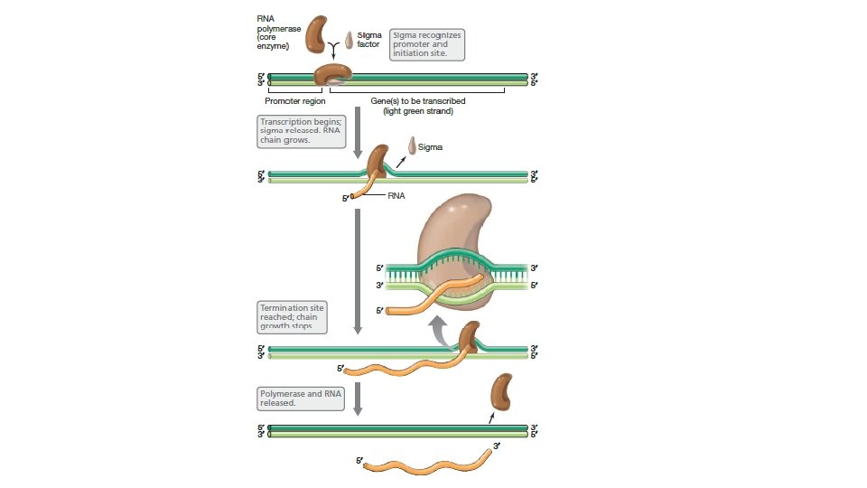 • RNA polimeraz • En basit yapılı olaran Bacteria RNA polimerazı, β, β’, α, ω(omega) ve σ(sigma) olarak tanımlanan 5 farklı birime sahiptir. Alt birimler biri ile etkilşerek RNA polimeraz holoenzimi olustururlar. Fakat sigma faktörü, diğerleri gibi kuvverli bağlanamaz ve kolaylıklar ayrılarak Rna polimeraz kor enzimi olarak isimlendirilen enzimin oluşmasına yol açar. Kor enzimi kendi basına RNA yı sentezleyebilir. Sigmanın rolü RNA sentezinin baslayabilmesi için DNA üzerindeki uygun bölgesinin tanınmasını saglamaktır.