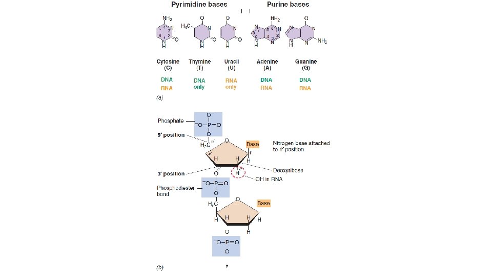 • Genel olarak DNA ve RNA yapıları birbirine benzer. Azot bazları olan pürinler iki bileşik heterosiklik halka, pirimidinler ise tek halkalı altı üyeli bir heterosiklik halka içerir. Guanin adenin ve sitozin hem DNA hem RNA da bulunur. DNA da timin yerine RNA da urasil bulunur. • Azot bazı ile şekerlerin bağlanmasına nükleozit adı verilir, çünkü fosfatı eksiktir. • Nükleotitler, nükleozite bir veya birden fazla fosfatın eklenmesi ile oluşur.