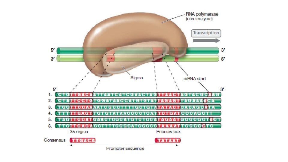 • Sigma faktörleri ve Korunmuş diziler • Promotorlsar RNA dizisinin bağlandıgı ozel DNA dizileridir. Bunlar sigma faktörü tarafından tanınmasına rağmen diziler birinin aynısı değildir. Sigma promotor içindeki oldukca korunmuş kısa iki diziyi tanır. Bu korunmuş diziler transkiripsiyon baslama bölgesinin yukarısındadır. Dizilerden biri transkiprison bölgesi baslangıcıdan önceki 10 bazlık bir bolge olup -10 bölgesi, prinbow kutusu veya TATA kutusu olarak adlandırılır. İkinci bölge transkiripsiyon bölgesinin yaklasık 35 baz yukarısındadır. Bu dizideki konsensus TTGACA’dır.