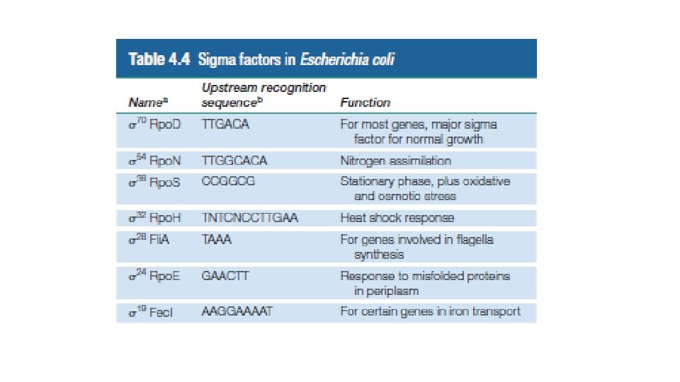 • E. colide cogu gen için standart sima 70 ihtiyac duyarken transkiripsiyon için birbiirne yakın ama farklı konsensus dizilerine tanımak için çeşitli sigma faktörleri mevcuttur. • Her bir alternatif sigma faktörü cesitli kosullarda spesifik bir gen gurubu için gerekli olup aynı zamanda ilgili genlerin düzenlenmesi için de esastır.
