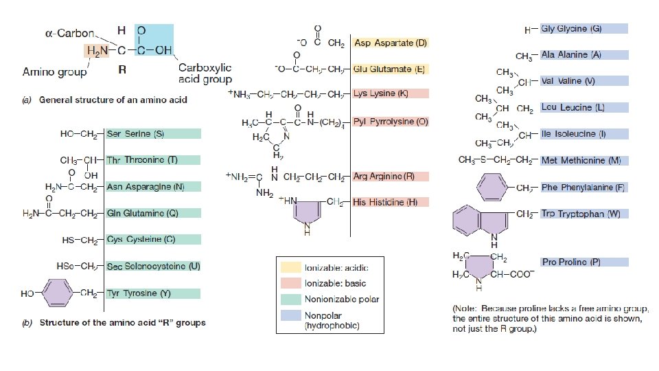 • Bütün amino asitler α-karbona bağlı bir amino grubu (-NH 2) ve bir karboksilik asit grubuna sahiptirler (-COOH). Bir amino asidin karboksil karbonu ile ikinci bir amino asidin azotu arasında oluşan bag peptid bagı olarak bilinir. İki amino asidin bağlanması ile oluşan yapıya dipeptid üçlü yapıya tripeptid cok yapıya polipeptid adı verilir. • Her bir amino asidin kendi ozgü bir yan zinciri vardır ve bunlar ‘R’ harfi ile ifade edilir. Bu yan zincirler amino asidin kimyasal özelliklerini belirlemede oldukça önemlidir. Benzer kimyasal özelliklere sahip amino asitler birbiriyle ilişkili aileler olarak gruplandırılır.