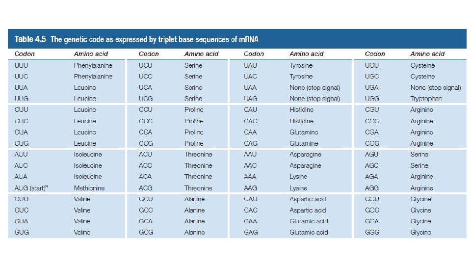 • Ökaryotlarda herbir genden tekbir m. RNA transkiribe edilirken prokaryotlarda ise tek bir m. RNA molekülü birden fazla genin genetik bilgisini taşıyabilir. Bunun anlamı birden fazla gen kodlayan genetik bilgiye sahip olmasıdır. • Genlerin baz dizileri le polipeptidlerin amino asitleri arasında doğrusal bir haberleşme mevcuttur. • m. RNA molekülü üzerinde üc baz grubu bir amino asidi kodlar ve her bir üçlü baza kodon adı verilir. Kodonlar ribozomlarda amino asit dizilerine çevrilir. , t. RNA ve yardımcı proteinler translasyon faktörleri olarak adlandırılır.