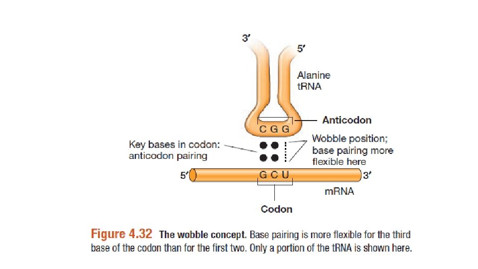 • Genetik Kodun Özellikleri • m. RNA üzerinde taşınan genetik bilginin kodlandığı 22 amino asit bulunmaktadır. Sonuc olarak 64 tane kodun bulunduğu için birçok amin oasit birden fazla kodon tarafından kodlanabilir. • Bir kodon t. RNA’nın bir parçası olan antikodon adlı üç bazlı bir tamamlayıcı bir dizi ile özgül baz eşleşmesi sonucu tanınır. Bazı durumlarda ilk baz poziyonda stnadat baz eşleşmesi oluşurken üçüncü pozisyondaki kuralısız baz eşlemesini tolere ederler. Bu durum wobble hipotezi olarak adlandırılır.