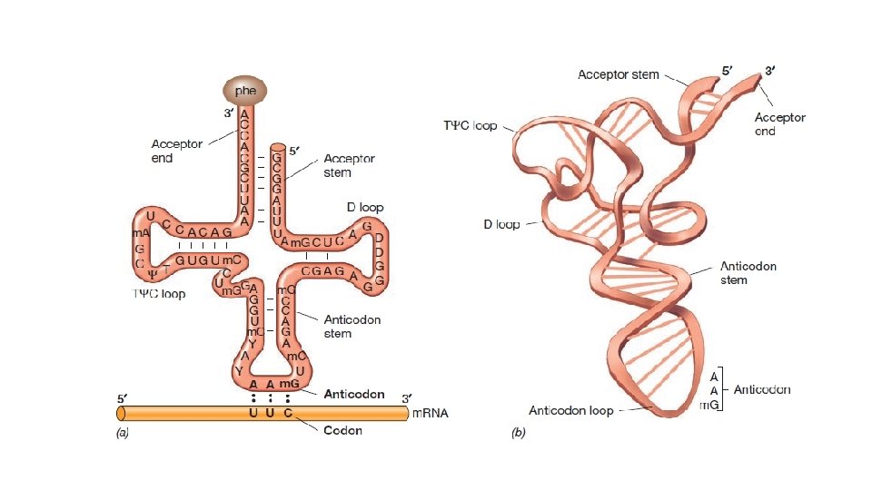 • t. RNA nın genel Yapısı • Bakteri hücrelerinde 60 farklı t. RNA vardır. Transfer rna molekülleri kapsamlı sekonder yapı içeren kısa tek zincirli moleküller olup 73 -93 nükleotit uzunluğundadırlar. Belirli bazlar ve sekonder yapılar tüm t. RNA’larda sabitken diğer kısımlar değişkendir. Olgun ve aktif t. RNA, molekül içerisinde ilave çift zincirli bölgeler içerir. Bu sekonder yapı tek zincirli molekülün kendi üzerinde katlanması ile meydana gelir. t. RNA sekonder yapısındaki bazı kısımlar onların fonksiyonlarına göre isimlendirlir. (antikodon haklası, alıcı kök gibi)