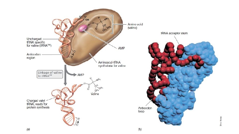 • t. RNA’ların tanınması aktivasyonuve yüklenmesi • Amino açil t. RNA sentetaz tarafından doğru t. RNA’nın tanınması t. RNA ve sentetaz arasında bazı anaktar bölgeleri arasında bir uyum gerektirir. • Amino açil t. RNA sentetaz tarafından kaalize edilen amino asit ve t. RNA arasındaki özggül reaksiyon amino asitin ATP reaksiyonu le aktivite edilmesi ile baslar. • Amino asit+ATP < == > amino açil-AMP+P-P oluşan amino açil-AMO ara ürünü uygun t. RNA molekülü ile karsılasana dek t. RNA sentetaza bağlı kalır. Daha sonra sekilde gösterildiği üzere yüklü bir t. RNA olusturabilmek için aktive edilmiş amino asit, t. RNA ya bağlanır. Aminoçil-AMP+t. RNA < == > aminoaçil-t. RNA +AMP