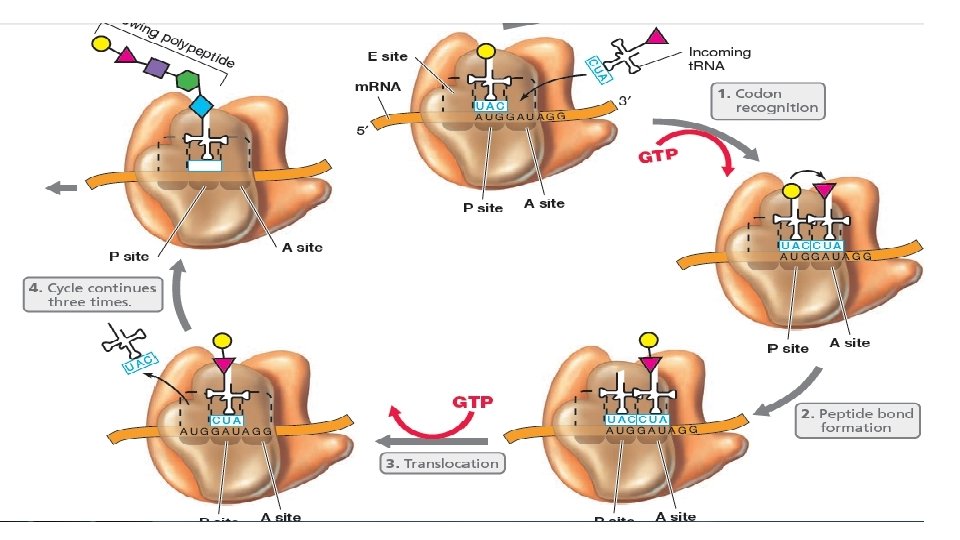 • Uzamauzamayı takiben polipeptidi tutan t. RNA A bölgesinden P bölgesine translokasyonna ugrar (taşınır), dolayısıyla A bölgesinde yeni yüklenmiş bir t. RNA için yer acılmıs olur. Translokasyon, EF-G uzama faktörüne her bir translokasyon olayı için bir molekül GTP ye ihtiyac duyarlar. Her trasnlokasyon basamagında A bögelsinde yeni bir kodon açığa çıkacak şekilde ribozom 3 nükletit ilerler. Translokasyon bu asamada yüksüz olan t. RNA yı 3. bölge olan E bölgesine iter. t. RNA ribozomun bu bölgesinde serbest bırakılır.