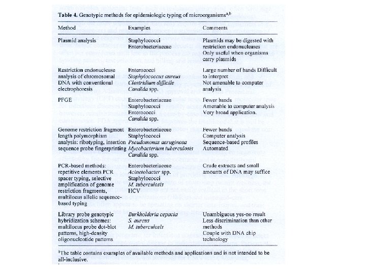 Genotyping methods used in bacteria A. Methods without DNA amplification Restriction endonuclease analysis PFGE of DNA macrorestriction fragments Field inversion gel electrophoresis Small fragment restriction endonuclease analysis Selective restriction fragment hybridizatin Ribotyping IS typing Prophage profiling Plasmid profiling Restriction endonuclease analysis of plasmids