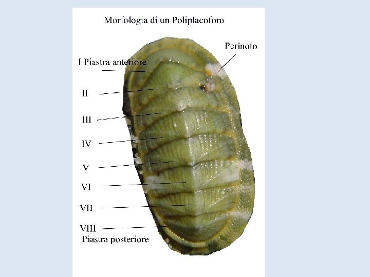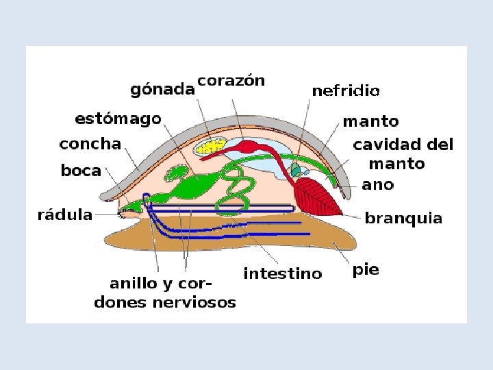 Anatomía externa • Son animales de cuerpo blando (divididos en cabeza, masa visceral y pie) con tres características únicas en el reino animal por las cuales se identifican: • Un pie muscular. • Una concha calcárea secretada por un integumento subyacente llamado manto, en ocasiones ausente. • Un órgano de alimentación llamado rádula (formada por hileras de dientes quitinosos curvos).