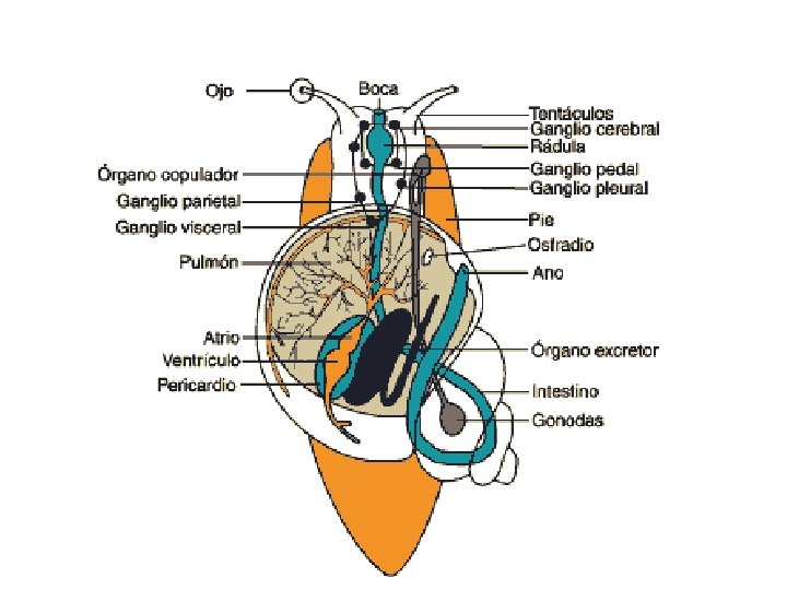 Pie: órgano característico y muy diversificado • El pie de los moluscos muestra una enorme plasticidad evolutiva. • Está dotado de una musculatura compleja y potente. Se supone que, primitivamente, era reptante (parecido al de los gasterópodos actuales (caracoles y babosas), pero ha experimentado un gran diversificación, originando el pie excavador de los bivalvos, el pie escindido en tentáculos de los cefalópodos o el pie nadador de algunos gasterópodos pelágicos, entre otros.