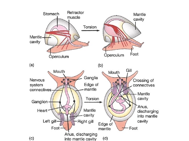Torsion • “twisted” body – 180 degree rotation of visceral mass –Significance: allows the snail to retract it’s head into the shell first and it’s foot last.