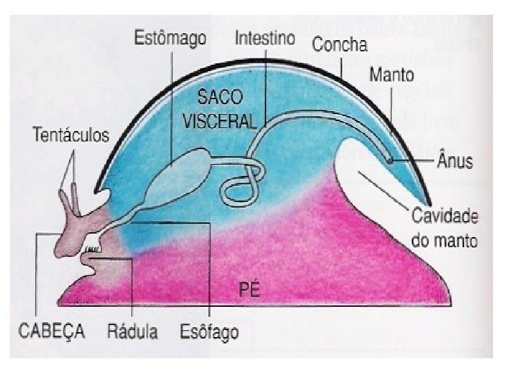 • Presença de olhos e tentáculos na cabeça; • Presença de RÁDULA: estrutura de quitina para trituração dos alimentos.