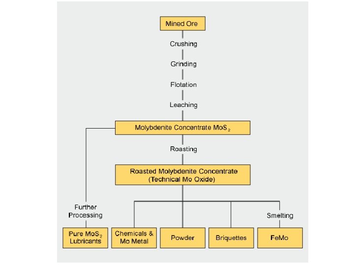 Molybdenum processing Upgrading from Tech Oxide About 25% of the roasted molybdite concentrate produced worldwide is processed into a number of chemical products. Upgrading is performed • by sublimation to produce pure molybdic oxide Mo. O 3 (at 900 -1100 o. C in air flow) • by wet chemical processes to produce a wide range of pure molybdenum chemicals (mainly molybdic oxides and molybdates)