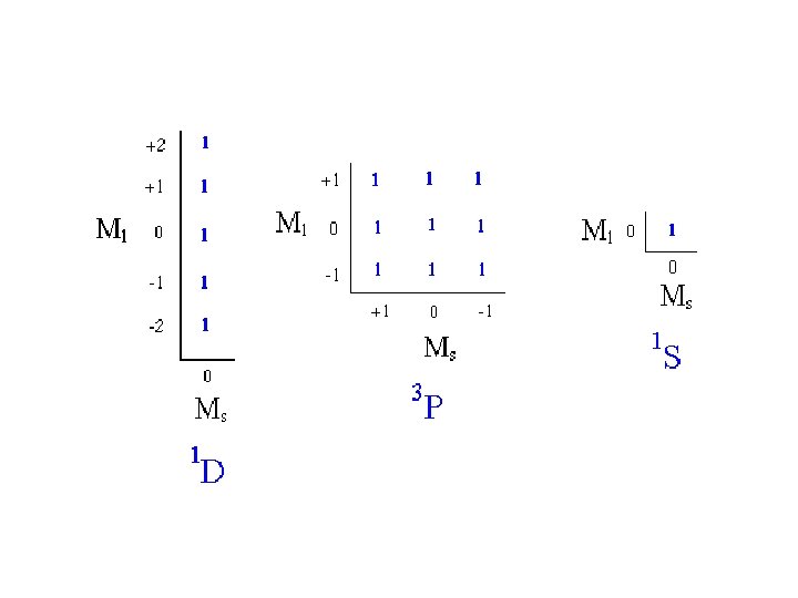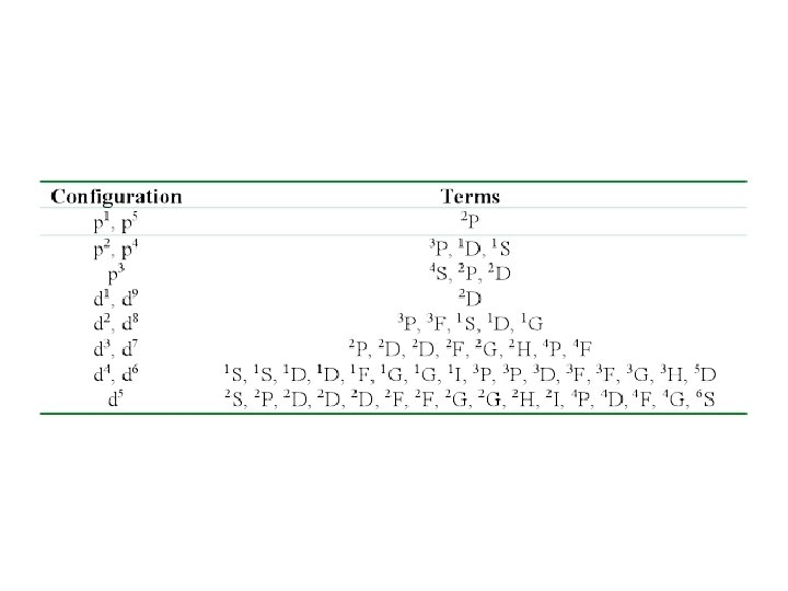 Caùc traïng thaùi cuûa nguyeân töû coù 2 electron ôû lôùp voû d Do ñoù S = 0 vôùi caùc traïng thaùi : G ( L = 4 ), D ( L = 2 ) vaø S ( L = 0 ). Kyù hieäu cuûa caùc traïng thaùi naøy nhö sau : * L = 4 , S = 0 vaø J = L + S = 4 : * L = 2 , S = 0 vaø J = L + S = 2 : * L = 0 , S = 0 vaø J = L + S = 0 : 1 G 4 ( singlet ) 1 D 2 ( singlet ) 1 S ( singlet ) 0