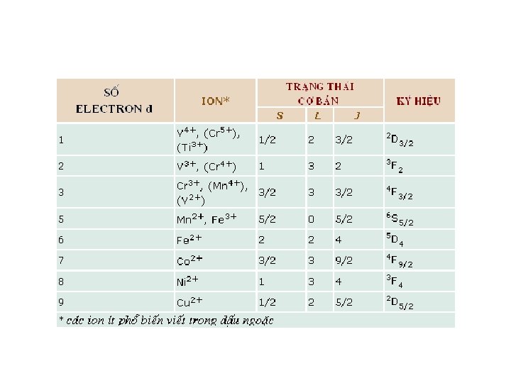 Ví duï 1 : ion Ce 3+ coù 1 electron f. Electron f coù l = 3 vaø s = ½ vaø ion chæ coù 1 electron ôû lôùp voû f neân L = 3 vaø S = 1/2. Vì lôùp voû ñaày döôùi moät nöûa neân J = |L – S| = 5/2. Do ñoù traïng thaùi cô baûn cuûa ion Ce 3+ laø 2 F 5/2. Ví duï 2 : Ion Pr 3+ coù 2 electron ôû lôùp voû f. Moãi electron ñoù coù l = 3 , s = ½ vaø ml = 3, 2, 1, 0, -1, -2, -3. Theo 1) : S = ½ + ½ = 1 Theo 2) ñeå coù L lôùn nhaát maø khoâng vi phaïm nguyeân lyù loaïi tröø thì 1 electron coù ml = 3 vaø 1 electron coù ml =2. Do ñoù m. L = 3 + 2 = 5 hay L = 5. Vì lôùp f ñaày döôùi moät nöûa neân J = | L – S | = 5 – 1 = 4. Traïng thaùi cô baûn cuûa ion 3 H 4.