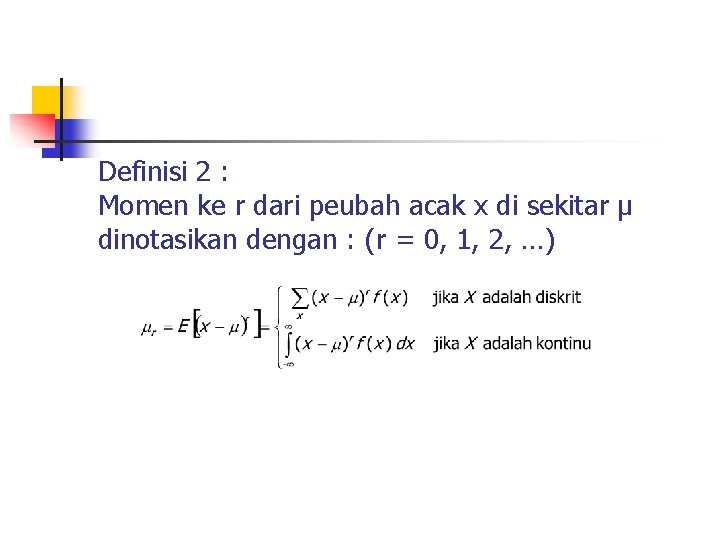 Definisi 2 : Momen ke r dari peubah acak x di sekitar µ dinotasikan dengan : (r = 0, 1, 2, …)