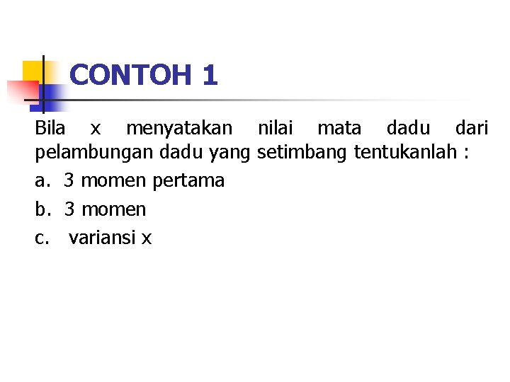 CONTOH 1 Bila x menyatakan nilai mata dadu dari pelambungan dadu yang setimbang tentukanlah : a. 3 momen pertama b. 3 momen c. variansi x