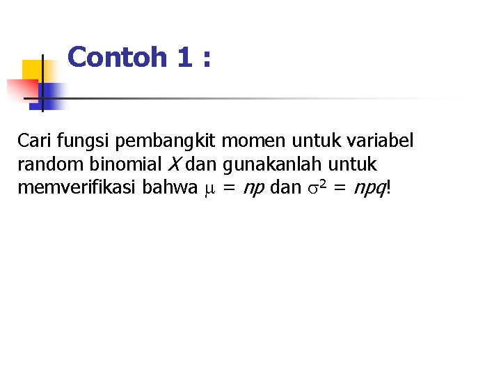 Contoh 1 : Cari fungsi pembangkit momen untuk variabel random binomial X dan gunakanlah untuk memverifikasi bahwa = np dan 2 = npq!
