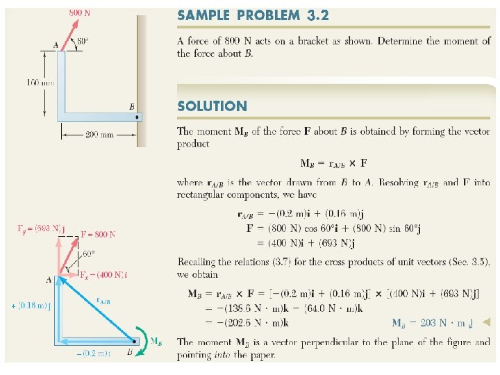 Alternative Solution (Using Varignon’s Theorem): Assuming that the counterclockwise moment is positive; MB = - Fx. (0. 16 m) - Fy. (0. 2 m) where Fx= 400 N and Fy= 693 N MB = -400 N(0. 16 m)-693 N(0. 2 m) = -202. 6 N. m We can say MB = -203 N. m Since we assumed that the counterclockwise moment is positive and we obtained a negative moment value, this implies that the direction of MB is actually clockwise. So; the result is exactly the same as before, i. e.