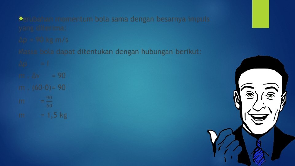 CONTOH SOAL Dalam sebuah permainan sepak bola, seorang pemain melakukan tendangan pinalti. Tepat setelah ditendang bola melambung dengan kecepatan 60 m/s. Bila gaya bendanya 300 N dan sepatu pemain menyentuh bola selama 0, 3 s maka tentukan: Impuls yang bekerja pada bola Perubahan momentumya, Massa bola Jawab: V 0 = 60 m/s F = 300 N ∆t = 0, 3 s Impuls yang bekerja pada bola sebesar: I = F. ∆t = 300. 0, 3 = 90 Ns
