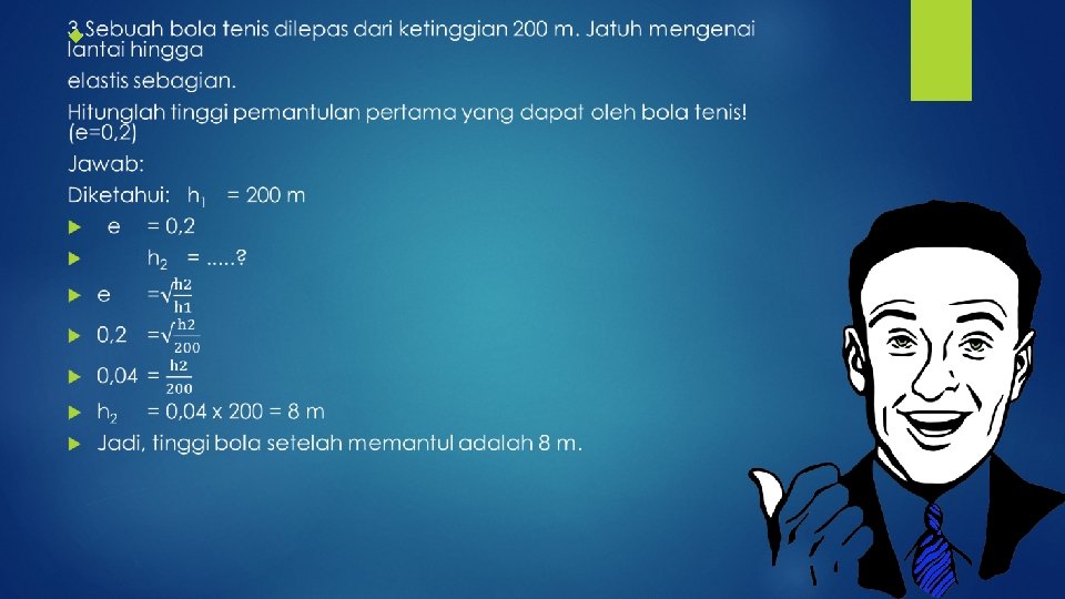 2. Balok kayu tergantung oleh seutas tali yang panjangnya I=40 cm. Balok tersebut ditembak mendatar dengan sebutir peluru yang bermassa 20 gr dan kecepatan vp. Massa balok 9, 98 kg dan percepatan gravitasi 10 m/s. Jika peluru mengenai balok bersarang di dalamnya sehingga balok dapat bergerak naik setinggi 10 cm maka: Berapakah kecepatan peluru tersebut? Jawab: Diketahui: mp = 20 gr = 0, 02 kg mb = 9, 98 kg g = 10 m/s h = 10 cm = 0, 1 m vp =. . . ?