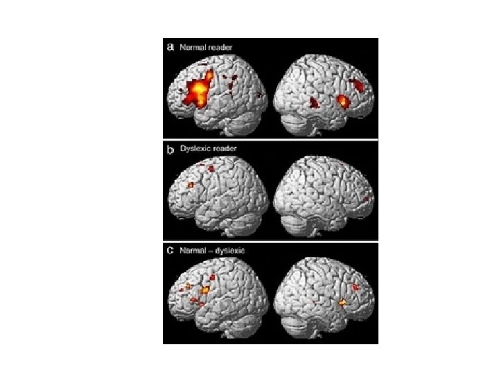 Phonemes Grigorenko (1977) Chromosomes 6 and 15 linked to a weakness in phonological awareness Lateralization Mc. Loughlin et al (2002) memory in the right and left frontal lobe, right more than left (Galaburda, 1989) but less dominance so ‘confused laterality’ Magnocellular Stein and Walsh (1997) speed of movement between cells