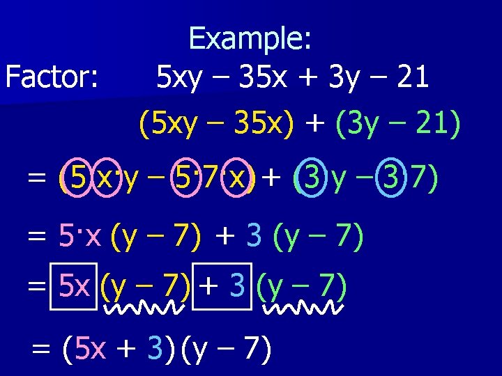 1. Group Factor: terms with ( ). Example: 5 xy – 35 x + 3 y – 21 (5 xy – 35 x) + (3 y – 21) = 5 x (y – 7) + 3 (y – = (5 x + 3) (y – 7) 2. Pull out 7) GCF from each group. 3. Split into factors.
