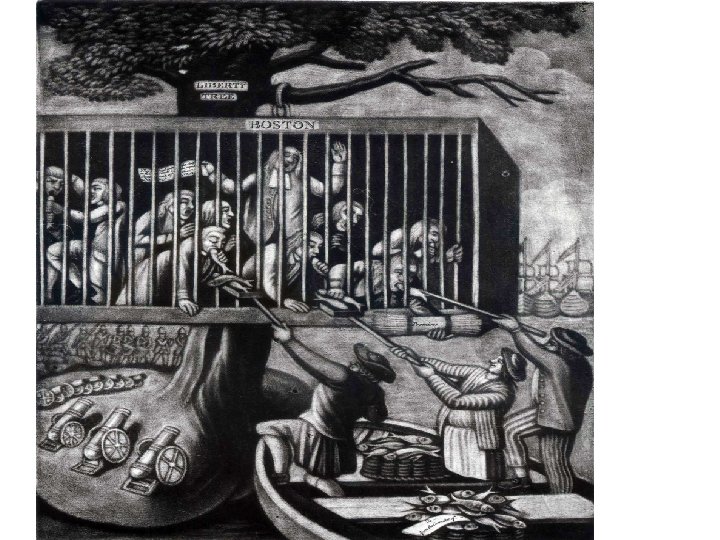 Boston Tea Party • On Dec. 16, 1773, about 50 Sons of Liberty, led by Sam Adams, dressed as Mohawk Indians. • They got onto the 3 ships in Boston Harbor and dumped 342 chests, 90, 000 lbs. , of tea into the water. ($700, 000) • Everybody cheered!