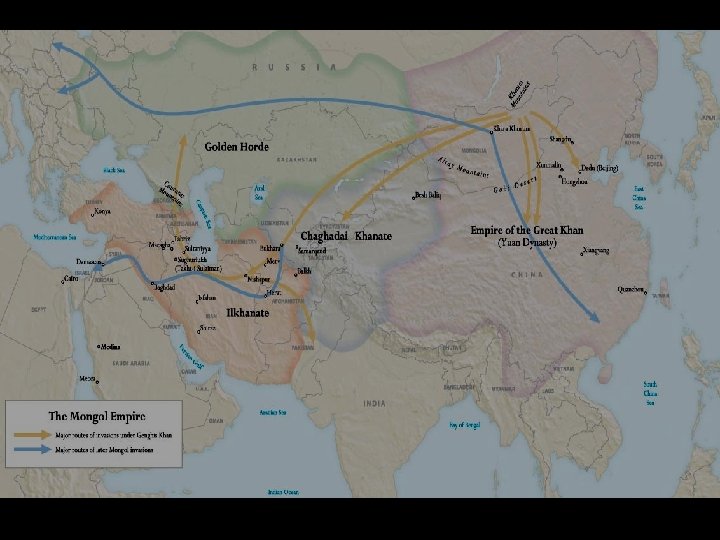 Conquests n n Under the leadership of Genghis Khan, the combination of Mongol discipline, technology, strategy, and ruthlessness helped the Mongols take control of Central Asia, then Northern China. By Genghis Khan’s death in 1220 s, Mongol armies had moved west into the Islamic lands and Central Europe. 1206 -1227