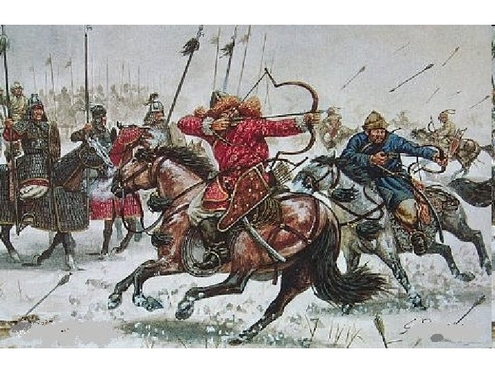 Mongol War Equipment (don’t write) n The warrior carried a protective shield made of light leather armor • which was impregnated with a lacquer-like substance in order to make it more impervious to penetration by arrows, swords and knives, and also to protect it against humid weather n The Mongol warrior used to wear Chinese silk underwear, if it could be obtained, because it was a very tough substance • If arrows are shot from a long distance, it would not penetrate the silk • It would also prevent poison from entering the bloodstream n n n During winter they wore several layers of wool as well as heavy leather boots with felt socks on their feet. The legs were often protected by overlapping iron plates resembling fish scales, which were sewn into the boots. Each warrior carried a battle axe, a curved sword known as scimitar; a lance, and two versions of their most famous weapon: the Mongol re-curved bow. • One of the bows was light and could be fired rapidly from horseback, the other one was heavier and designed for long-range use from a ground position