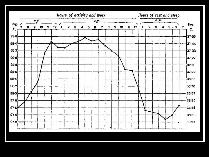 Monitoraggio della TC n n La misurazione della TC è uno degli atti infermieristici più comuni in ambiente ospedaliero Non vi è unanime giudizio su quale debba essere la normale TC Valore accettato = 36, 8 -37°C con variazioni durante l’arco della giornata (minimo mattutino e picco pomeridiano). Nei pz anziani la TC è ↓ 0, 5°C rispetto ai più giovani Variazione a seconda del sito rilevato TC centrale è 1°C maggiore di quella ascellare e di 0, 5°C rispetto a quella orale