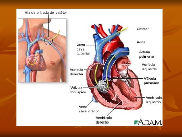 n n n La colocación de catéteres venosos centrales no solamente cumple con una función de monitorización (Presión Venosa Central) Además nos permite según el diámetro y la longitud del mismo, aportar volumen, administrar drogas irritativas ya sea por su osmolaridad o ph, alimentación parenteral, hemodiálisis o bien la inserción de catéteres por su lumen como el catéter de Swan Ganz o marcapasos endocavitarios.