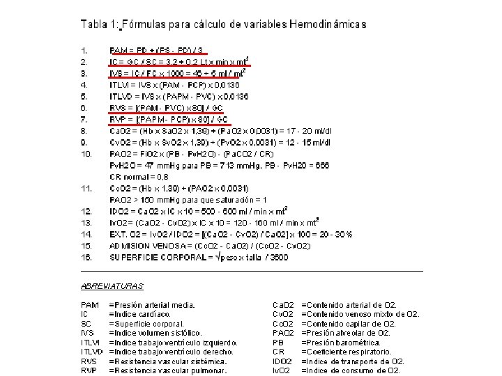 n n n D- Débito o gasto cardíaco: Es el producto de la frecuencia cardíaca (FC) por el volumen sistólico de eyección (VS) en litros por minuto. DC = FC x VS A menos que exista un shunt intracardíaco, el débito cardíaco derecho e izquierdo es básicamente el mismo. Para realizar la medición del débito es necesario insertar un catéter de Swan Ganz La decisión de medir el DC está dada por la sospecha de un déficit en la oxigenación tisular por alteraciones en la función cardíaca.