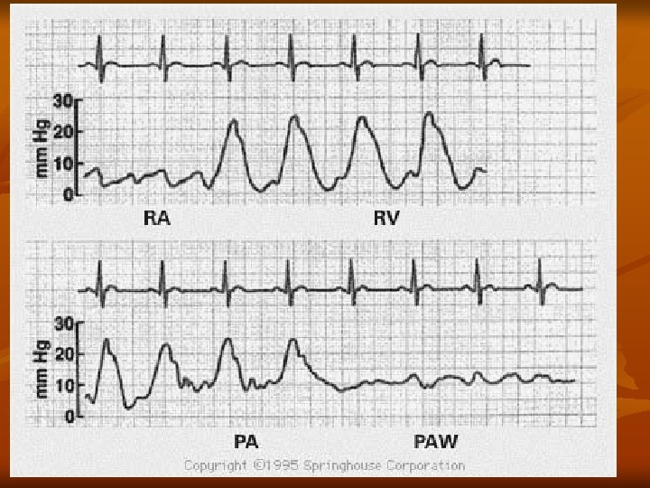 n n n Al avanzar el Swan-ganz por la circulación central, podemos medir : 1. - Presiones auriculares 2. - Presiones ventriculares derechas 3. - Presiones de la Arteria Pulmonar 4. - Presión de enclavamiento pulmonar o "el capilar pulmonar"