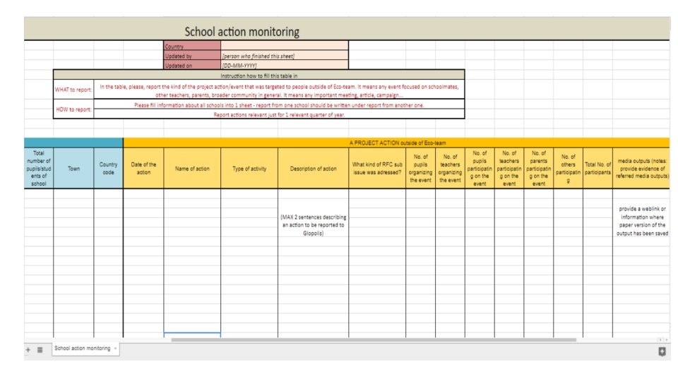 Outcomes gathering: coordination calls, monthly reports, learning circles Why to make learning circles? To learn together! ; -) The purpose is to build and extend our knowledge about development and environmental perspective of food systems and global education methods, exchange ideas and opinions in order to build our capacity to guide teachers during the project. How does it work? We come together in a group of max 7 people to exchange about inspiring project related content or methodology during a skype call of an hour. Everytime one different person facilitates the discussion. We discuss what surprised us, what were the key interesting facts about the issue, how it relates to what we are working on, etc. For whom is it? This targets in particular the people who will be the reference people for the project content in each countries (and who play a role in the trainings for teachers). It can be the country coordinators, or colleagues, or members of working groups. At least one person per country should take part, but more are welcome. How often does it happen? Once in two month. Two dates are proposed for the skype call. People just sign up for one of them.