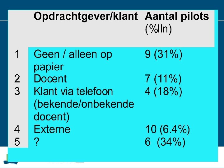 In PTA? Aantal pilots Ja 15 Nee, wel gewenst 7 Nee, formatief 5 Anders 2 Onbekend 5