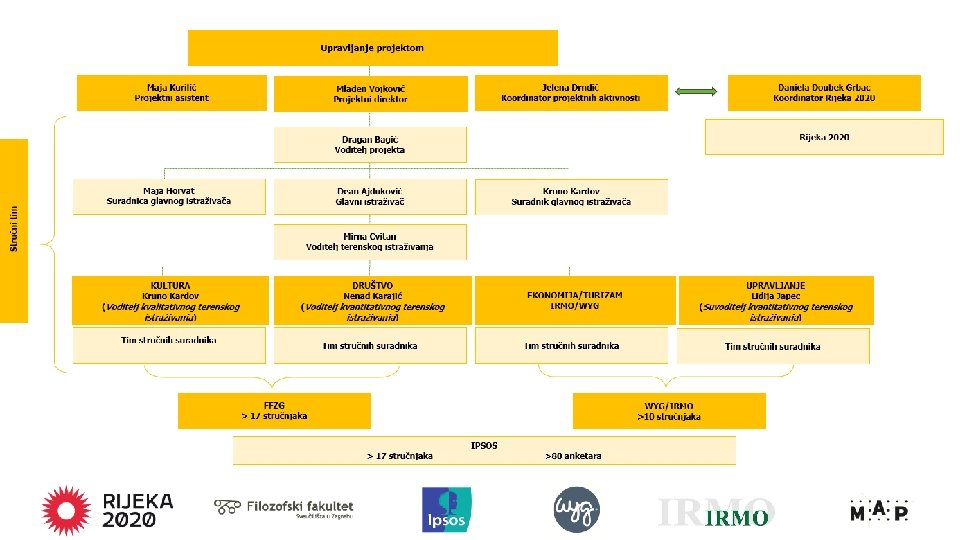 Tko smo? PREDSTAVLJANJE ZAJEDNICE UGOVARATELJA Stručnjak Pozicija Uloga dr. sc. Dragan Bagić Voditelj projekta Koordinacija projektnih timova dr. sc. Dean Ajduković Glavni istraživač Razrada i koordinacija istraživanja Mirna Cvitan Voditelj terenskog istraživanja Kvantitativna i kvalitativna terenska istraživanja primarno u području kulture i društvene kohezije dr. sc. Nenad Karajić Voditelj kvantitativnog terenskog istraživanja Koordinacija kvantitativnog terenskog istraživanja i sektorskog tima za društveno područje dr. sc. Kruno Kardov Voditelj kvalitativnog terenskog istraživanja Koordinacija kvalitativnog terenskog istraživanja i sektorskog tima za kulturno područje te suradnik glavnog istraživača Lidija Japec Suvoditelj kvantitativnog terenskog Koordinacija sektorskog tima upravljanje istraživanja Maja Horvat Suvoditelj kvalitativnog terenskog istraživanja Suradnica glavnog istraživača
