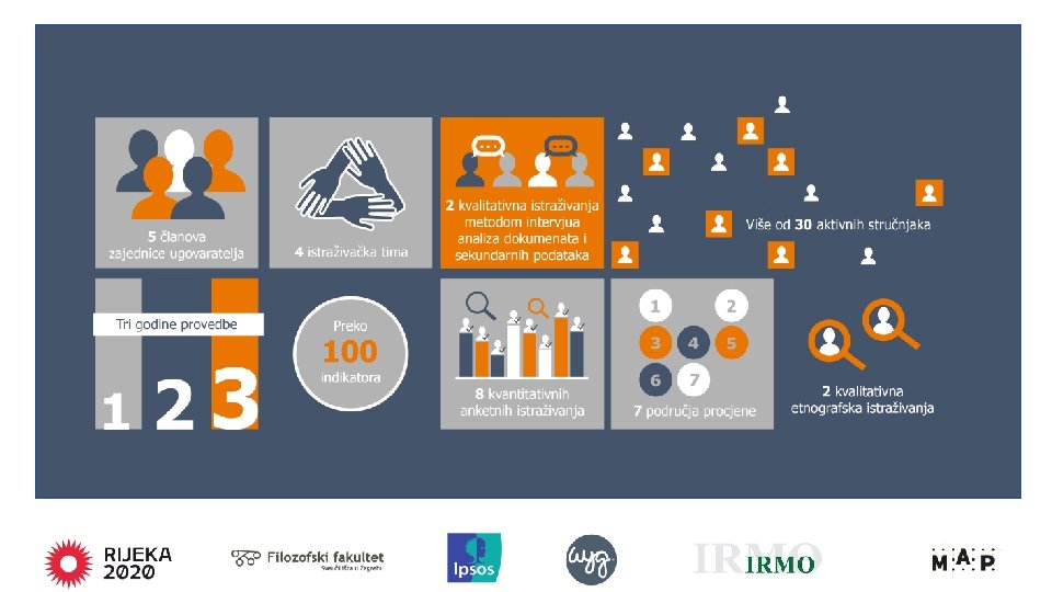 CILJEVI PROJEKTA • Osigurati podlogu i dokaze za donošenje odluka trgovačkog društva Rijeka 2020 davanjem preporuka za ostvarivanje ciljeva EPK; • Razviti integrativni koncept istraživanja kako bi se procijenili, mjerili i analizirali gospodarski, ekološki, društveni, kulturni rezultati i učinci projekta Rijeka 2020 u naslovnoj godini; • Kreirati bazu podataka rezultata i učinaka projekta EPK Rijeka 2020 koji su generirani prije godine kada Rijeka preuzima titulu, a koji će biti korišteni kao podloga za procjenu projekta u 2020. godini; • Kreirati bazu podataka rezultata i učinaka projekta u godini nakon preuzimanja titule EPK; • Razviti i implementirati okvir za otvoren i slobodan pristup podacima, izvješćima i studijama koji će poslužiti kao ostavština projekta Rijeka 2020.