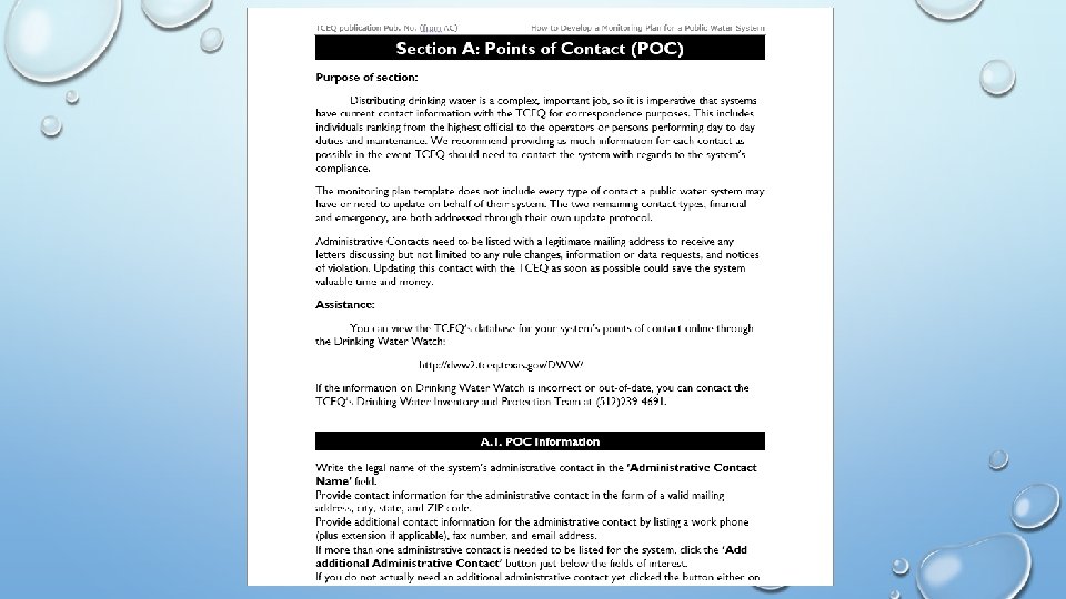 REGULATORY GUIDANCE 384 • DESIGNED TO ASSIST PUBLIC WATER SYSTEMS IN DEVELOPING THEIR MONITORING PLAN IN ACCORDANCE WITH § 290. 121 • BEING UPDATED TO INCLUDE REVISED TOTAL COLIFORM RULE (RTCR) AND OTHER CRITERIA CHANGED SINCE LAST UPDATE • INCLUDES INSTRUCTIONS FOR COMPLETING THE NEW MONITORING PLAN TEMPLATE THAT ALL WATER SYSTEMS WILL BE ENCOURAGED TO USE • TO BE POSTED ON TCEQ’S MONITORING PLAN WEBSITE: • HTTPS: //WWW. TCEQ. TEXAS. GOV/DRINKINGWATER/MONITORING_PLANS/MONITORING_P LANS. HTML