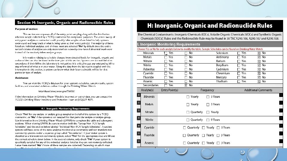 30 TAC § 290. 121 MONITORING PLANS • ALL PUBLIC WATER SYSTEMS MUST DRAFT AND MAINTAIN AN UP-TO-DATE CHEMICAL AND MICROBIOLOGICAL MONITORING PLAN. • SW / GUI SYSTEMS ARE REQUIRED TO SUBMIT REVISIONS AND UPDATED PLANS TO TCEQ • EVERY SYSTEM NEEDS TO KEEP A LOCAL COPY UP-TO-DATE • ANY SYSTEM SHALL SUBMIT AN UP-TO-DATE MONITORING PLAN TO THE TCEQ UPON REQUEST • SYSTEMS CAN ACCRUE VIOLATIONS FOR EITHER NOT HAVING A LOCAL MONITORING PLAN OR IF THE MONITORING PLAN DOES NOT ACCURATELY REPRESENT ALL SAMPLING TAKEN ON BEHALF OF THE SYSTEM