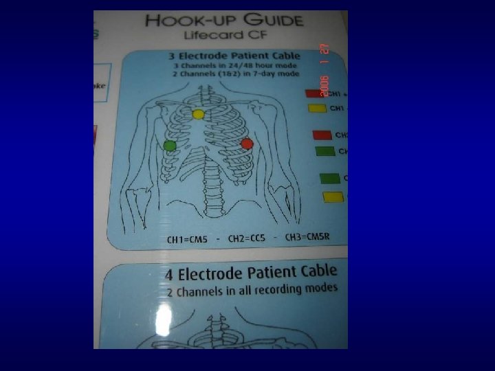 Technika Holterowskiego Monitorowania EKG Odprowadzenia używane w technice Holterowskiej odprowa dzenie Elektroda ujemna Elektroda dodatnia CS 1 Okolica podobojczykowa lewa w linii pachowej przedniej Pozycja V 1 CS 2 Okolica podobojczykowa lewa w bliższej 1/3 Pozycja V 2 CS 3 Jak wyżej Pozycja V 3 CM 5 Rękojeść mostka strona prawa Pozycja V 5 IS Okolica podobojczykowa lewa Kolec biodrowy lewy CC 6 Pozycja V 6 R Pozycja V 6