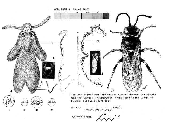 Ophrys orchid. The lower lip is shaped like, smells like and feels like a female wasp. Pollination is by pseudocopulation Male wasp on Ophrys.