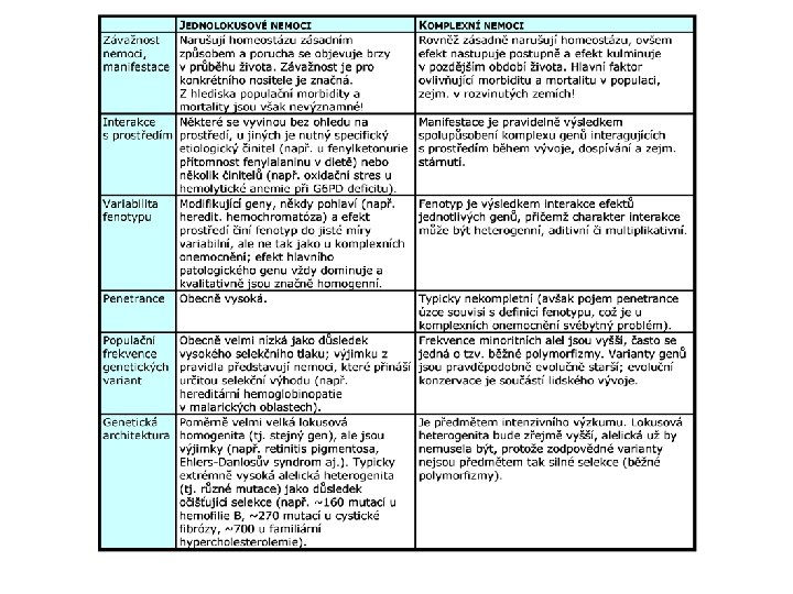 Komplexní nemoci • o • o • o neúplná penetrance patologického fenotypu u určité části osob, přestože zdědí nevýhodný genotyp (zde ve smyslu souboru vícero genů) se patologický fenotyp nerozvine existence fenokopií patologický fenotyp může být přítomen u lidí, kteří nejsou nosiči zmíněného genotypu genetickou heterogenitou (lokusovou a alelickou) klinický obraz není specifický, ale může se rozvinout v důsledku záměn v genech ležících na různých lokusech (= lokusová heterogenita), v jednotlivých genech může být přitom vícero mutací či polymorfizmů (= alelická heterogenita) polygenní dědičností predispozice k rozvoji patologického fenotypu se zvyšuje pouze při simultánním výskytu určitého souboru alel vysokou populační frekvencí alel zodpovědných za rozvoj patologického fenotypu každá jednotlivá predisponující alela pravděpodobně není sama o sobě výrazně patogenní spolupůsobením dalších mechanizmů přenosu mitochondriální dědičnost, imprinting
