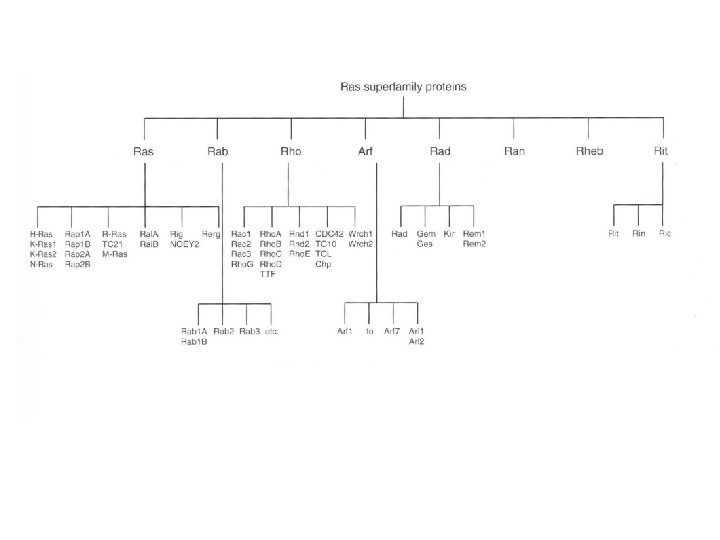 Classification of small GTPases • Over 150 mammalian proteins • The „Ras superfamily“ related proteins, further divided into families: Ras, Rab, Rho, Arf, Rad, Ran, Rheb, Rit