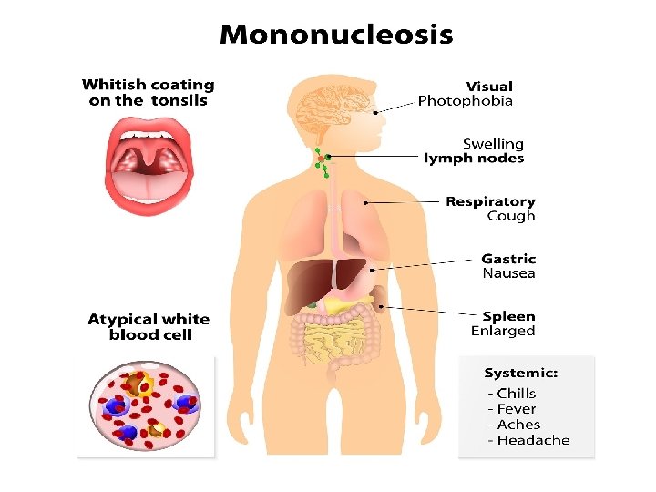 Manifestari clinice Copii mici = asimptomatici, faringita usoara ± tonsilita PERIOADA INCUBATIE : 4 - 6 saptamini PRODROM: 1 -2 saptamini: stare de rau, astenie, mialgii PER. DE STARE: FEBRA sapt 1 -2 ANGINA (50% din cazuri pseudo-membranoasa) ADENOPATIE: LATEROCERVICALA- GENERALIZATA SPLENOMEGALIE s 2 -3 HEPATOMEGALIE RASH MORBILIFORM rar spontan (5%), frecvent dupa administrare de ampicilina, mai frecvent pe brate si trunchi ENANTEM la limita intre palatul dur si moale EDEM PALPEBRAL