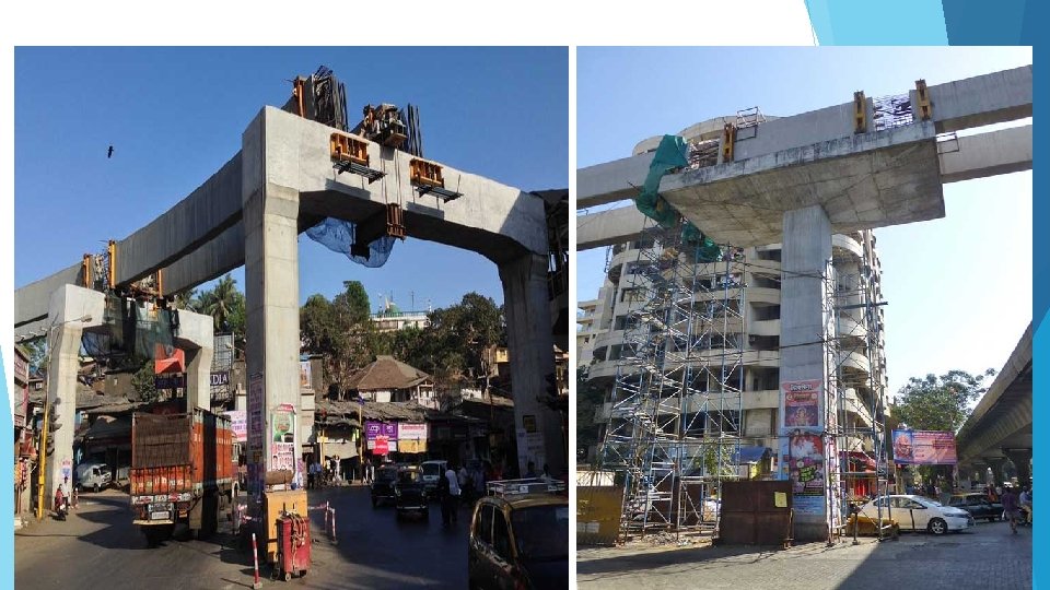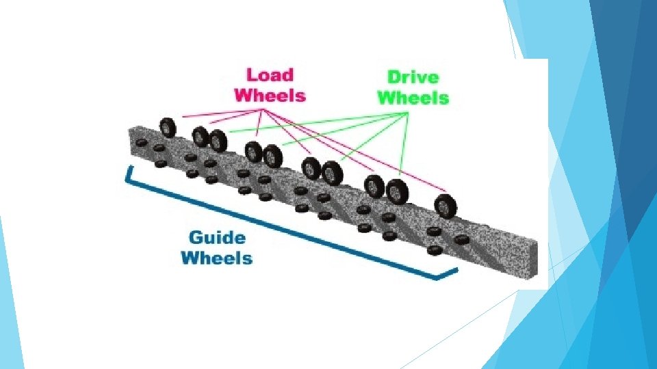 Ø Modern monorails are based on a single solid beam that supports and guides the train; the carriages are either suspended beneath the track, or sit on top. A steel or reinforced concrete beam in the range of 2 to 3 feet (0. 61 to 0. 91 m) wide is used as track. The straddle-beam style was popularized by the German company ALWEG. Conductive shoes on the carriages then transmit the current to the train. Monorail is raised at a minimum height of 5. 5 meters from ground level on columns. Ø The carriages have pneumatic rubber tyres, which drive along the top of beam. Rubbertired carriage contacts the beam on the top and both sides for traction and to stabilize the vehicle and to prevent side-to-side swaying of the train, and also helping to guide the carriages.