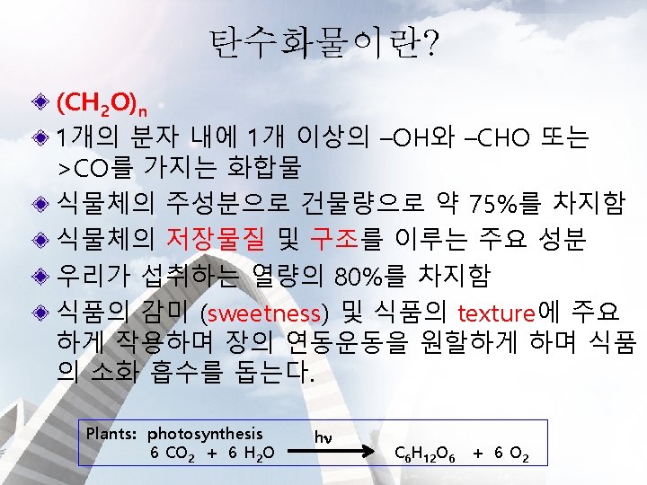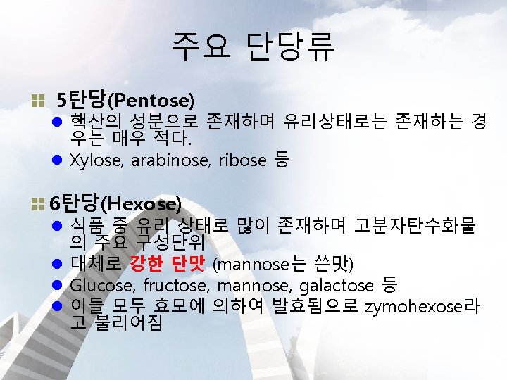 Deoxy sugars • 당류의 –OH가 –H로 치환된 것 • 2 -Deoxy-D-ribose: D-ribose에서 • 6 -Deoxy-L-mannose (L-rhamnose): flavon 계의 배당체 로 존재 • Digitalin(6 -Deoxy-D-glucose): 식물체의 배당체 • L-fucose (6 -Deoxy-L-galactose): 해조류