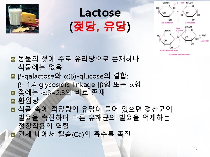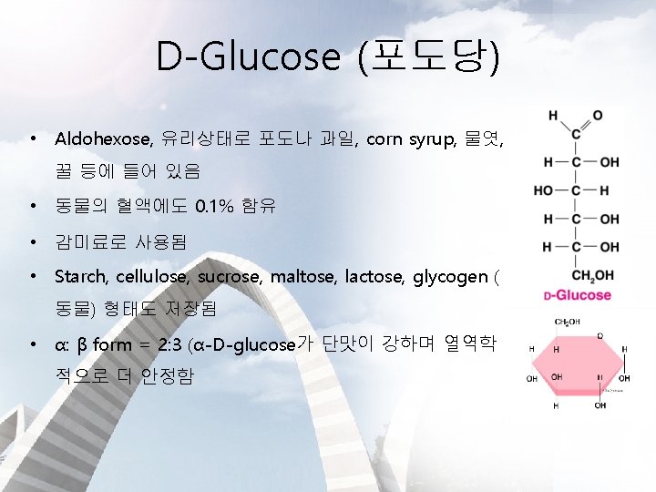 D-Galactose • Aldohexose로 lactose, melibiose, raffinose, galactan, 한천, 아라비아 고무 등의 구성성분 • 인지질(phospholipid)의 구성성분 23