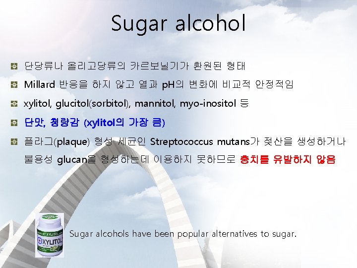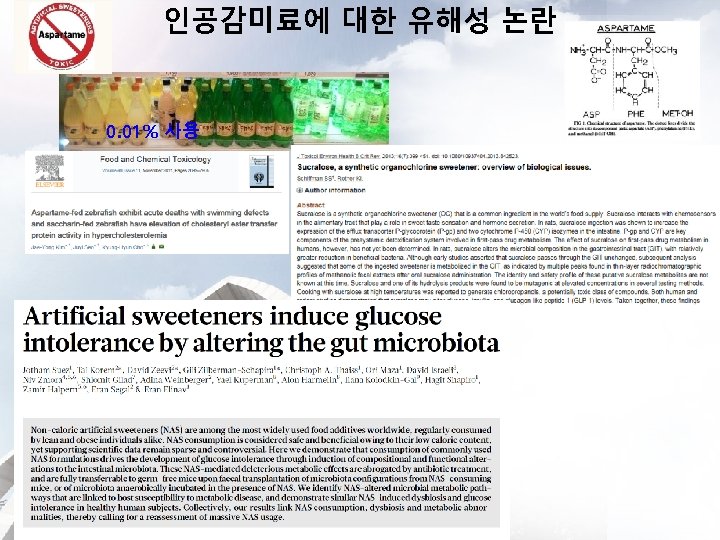 액상과당 vs. 결정과당 • 액상과당 - high fructose corn syrup (HFCS)또는 glucose-fructose syrup - HFCS 55: 55%의 fructose와 42%의 glucose, 대개 청량 음료에 쓰임 - HFCS 42: 42% frutose와 53%의 glucose, 음료수, 가공 식품, 시리얼, 구 운 음식 - HFCS 65: In a 100 gram serving, it supplies 281 Calories, whereas in one tablespoon of 19 grams, it supplies 53 Calories. Obesity and metabolic disorders (? ) • 결정과당 (fructose, fruit sugars)