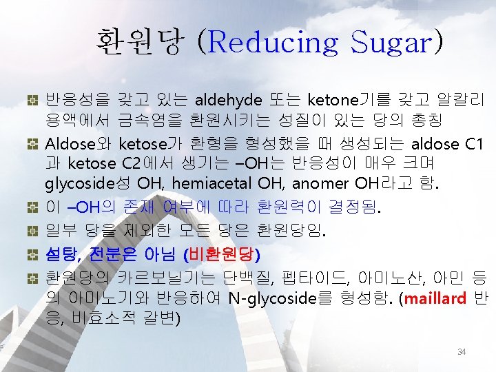 D-Glucose oxidation & reduction Benedicts reagent 환원 [Ag+] D-gluconic acid D-glucitol D-gluconolaconte 어떤 용액에서든 당류가 산화되면 평형 상태에서 모두 동일한 혼합물을 얻게 됨 30